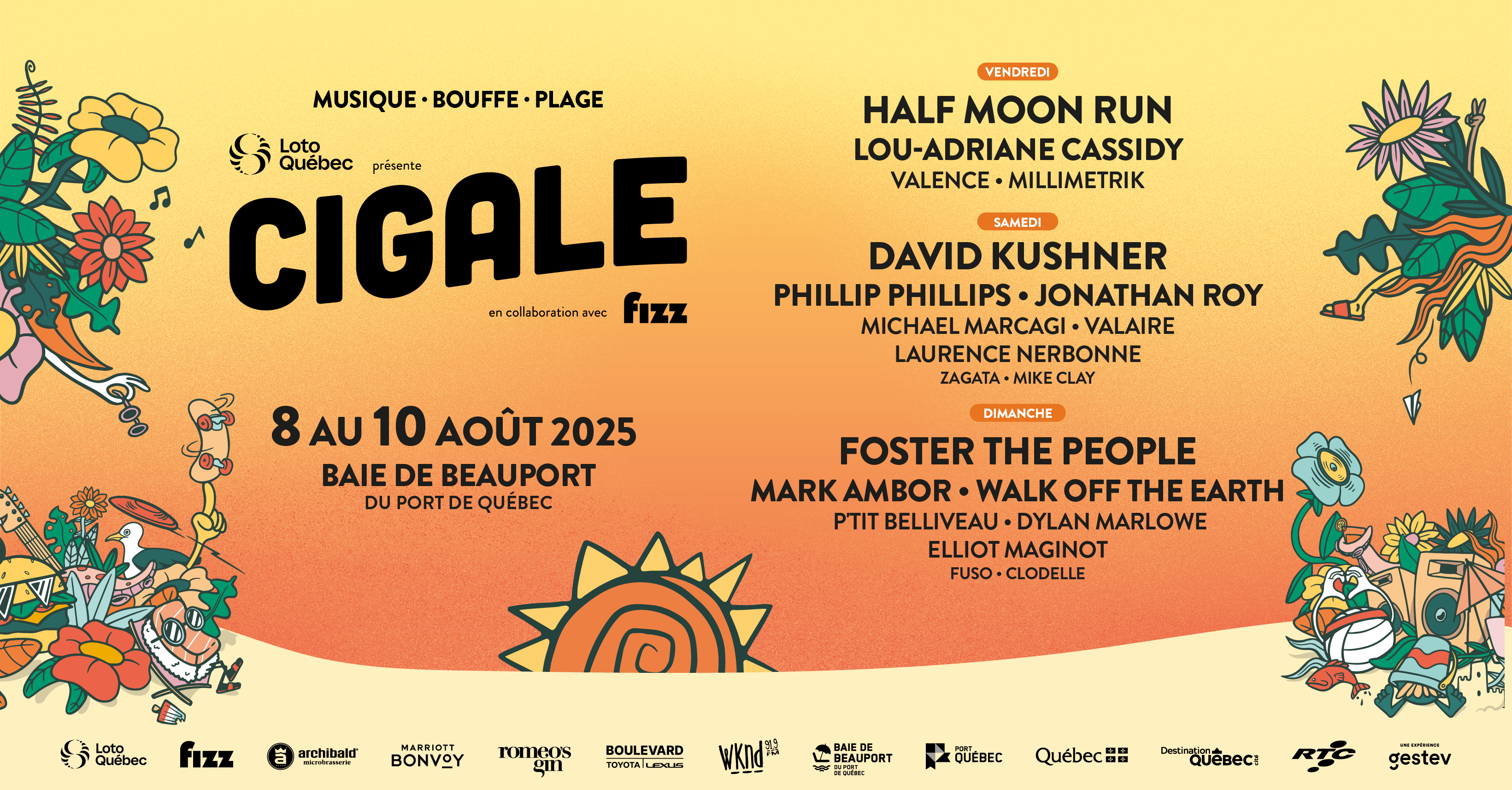Le festival Cigale est de retour pour 4e édition du festival une présentation de Loto-Québec en collaboration avec Fizz, et se tiendra les 8, 9 et 10 août 2025. Et belle nouveauté : l’événement se tiendra désormais sur trois jours sur la plage de la Baie de Beauport du Port de Québec. Half Moon Run, David Kushner et Foster The People seront les têtes d’affiche des trois journées de festivités sous le soleil.
