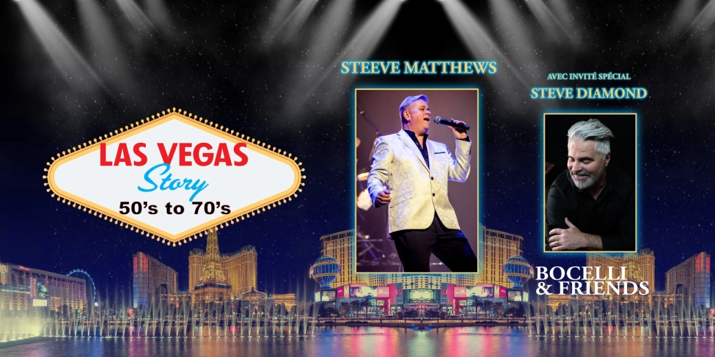 Steeve Matthews revient le 16 novembre prochain accompagné de ses huit musiciens et ses trois choristes, avec Las Vegas Story - 50’s to 70’s. Sous la direction musicale de Mirka (violon), ce spectacle de grande qualité et digne des ligues majeures vous promet une soirée où le charme, l’élégance et les performances sauront vous tenir en haleine tout au long de la soirée.
