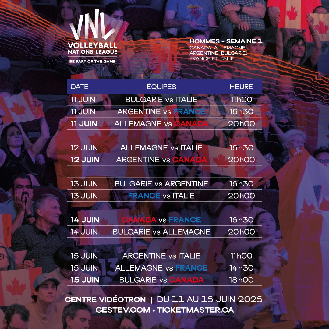 Soyez des nôtres du 11 au 15 juin 2025 à Québec pour la première semaine de phase préliminaire masculine de la LNV – six équipes, notamment le Canada, joueront quatre matchs sur cinq jours au Centre Vidéotron.