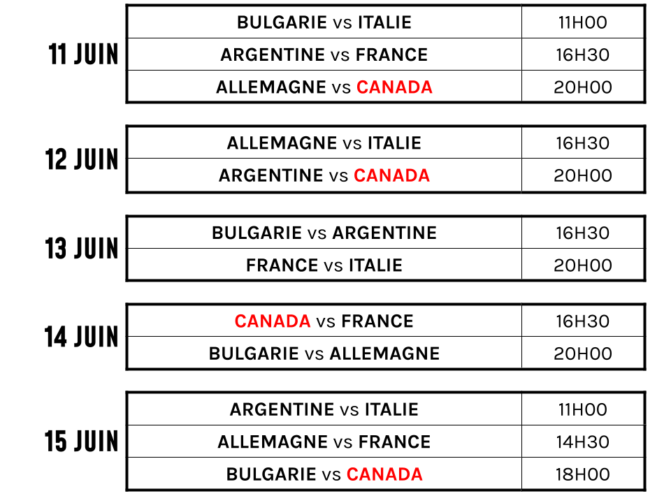 En plus du Canada, l’Argentine, la Bulgarie, l’Italie, l’Allemagne et la France, médaillée d’or olympique en titre, seront en action à Québec.