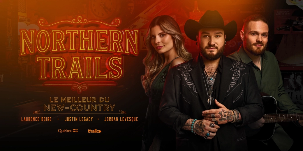 Northern Trails – Le Meilleur du New Country vous transporte au cœur des Honky Tonks de Nashville dans un spectacle électrisant qui célèbre les plus grands succès de la musique country actuelle. Porté par une formation musicale de haut calibre et trois interprètes au charisme indéniable — Justin Legacy, Laurence Doire et Jordan Levesque — le spectacle fait vibrer les classiques de Luke Combs, Chris Stapleton, Miranda Lambert, Keith Urban, Zac Brown Band, Morgan Wallen et plusieurs autres figures emblématiques.