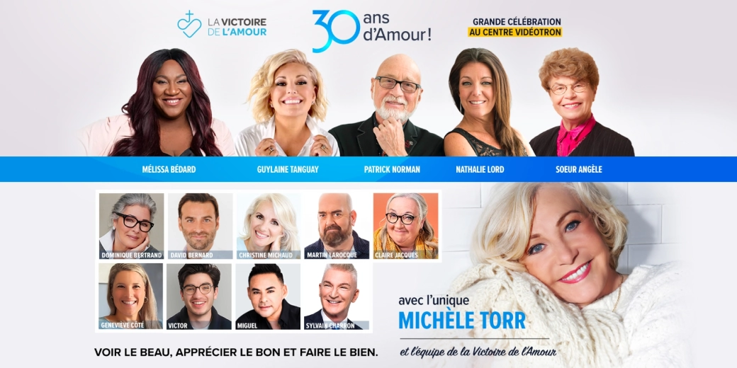 The program “La Victoire de l'Amour”, broadcast on the TVA network, will celebrate its 30th anniversary in 2025. Launched in 1995, this daily program has touched and inspired thousands of viewers by conveying a message of hope and love through faith-based testimonials and spiritual reflections on topics such as self-acceptance, mutual aid and forgiveness. To mark this exceptional milestone, a major celebration will be held on Saturday, May 24, 2025, at the Videotron Centre. Mélissa Bédard, Guylaine Tanguay, Patrick Norman, Nathalie Lord and the unique Sister Angèle will be on hand to celebrate this memorable event.