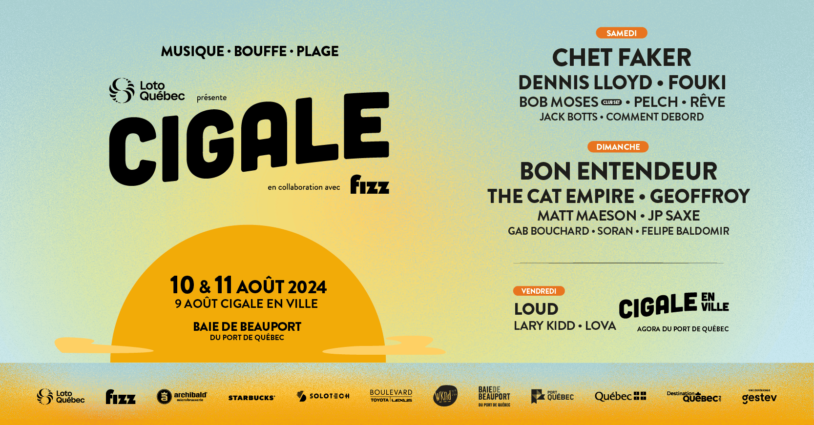 Cigale, presented by Loto-Québec in collaboration with Fizz, returns for a third edition on August 10th and 11th! The Beachside, Beats and Treats experience will take place on the Baie de Beauport - Port of Quebec site and will feature 16 local and international artists.