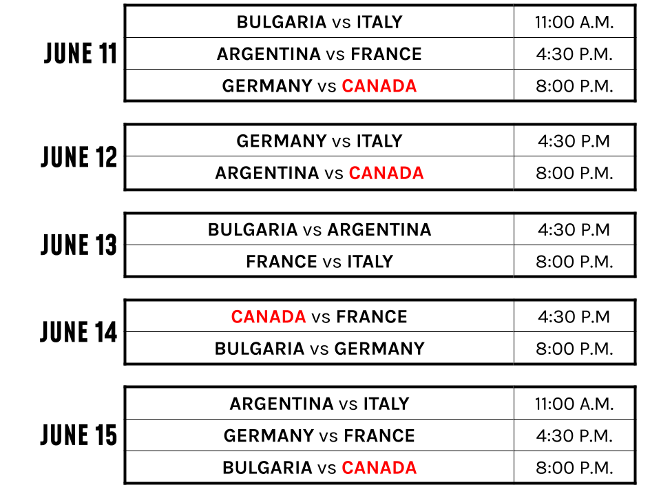 In addition to Team Canada, Argentina, Bulgaria, Italy, Germany and Olympic gold medalist France will compete in Quebec.