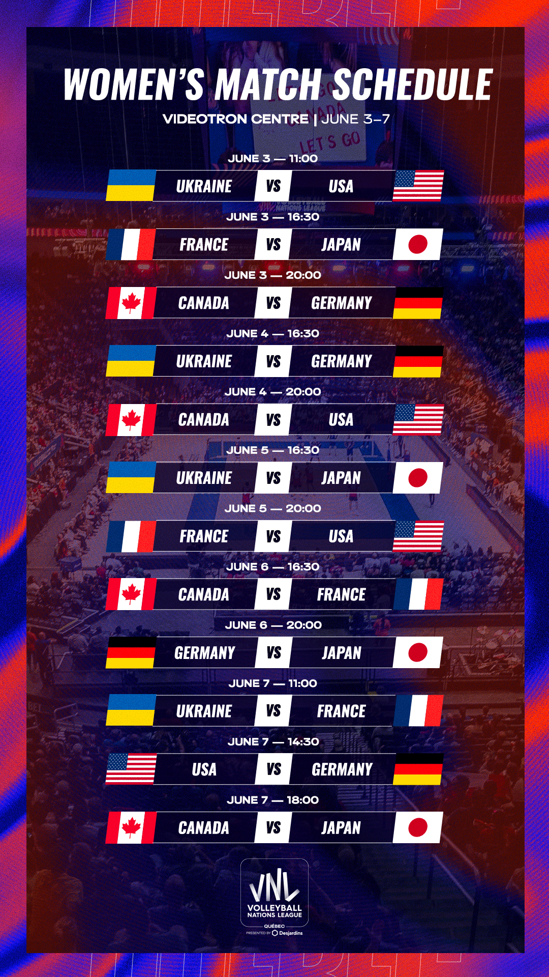 The Volleyball Nations League (VNL), one of the world’s most prestigious tournaments, will return to Centre Vidéotron from June 3 to 7, 2026.