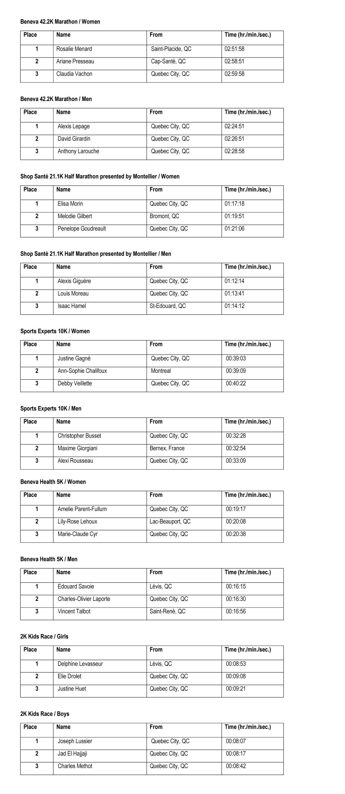 Results for the 26th annual Beneva Quebec City Marathon presented by Montellier: